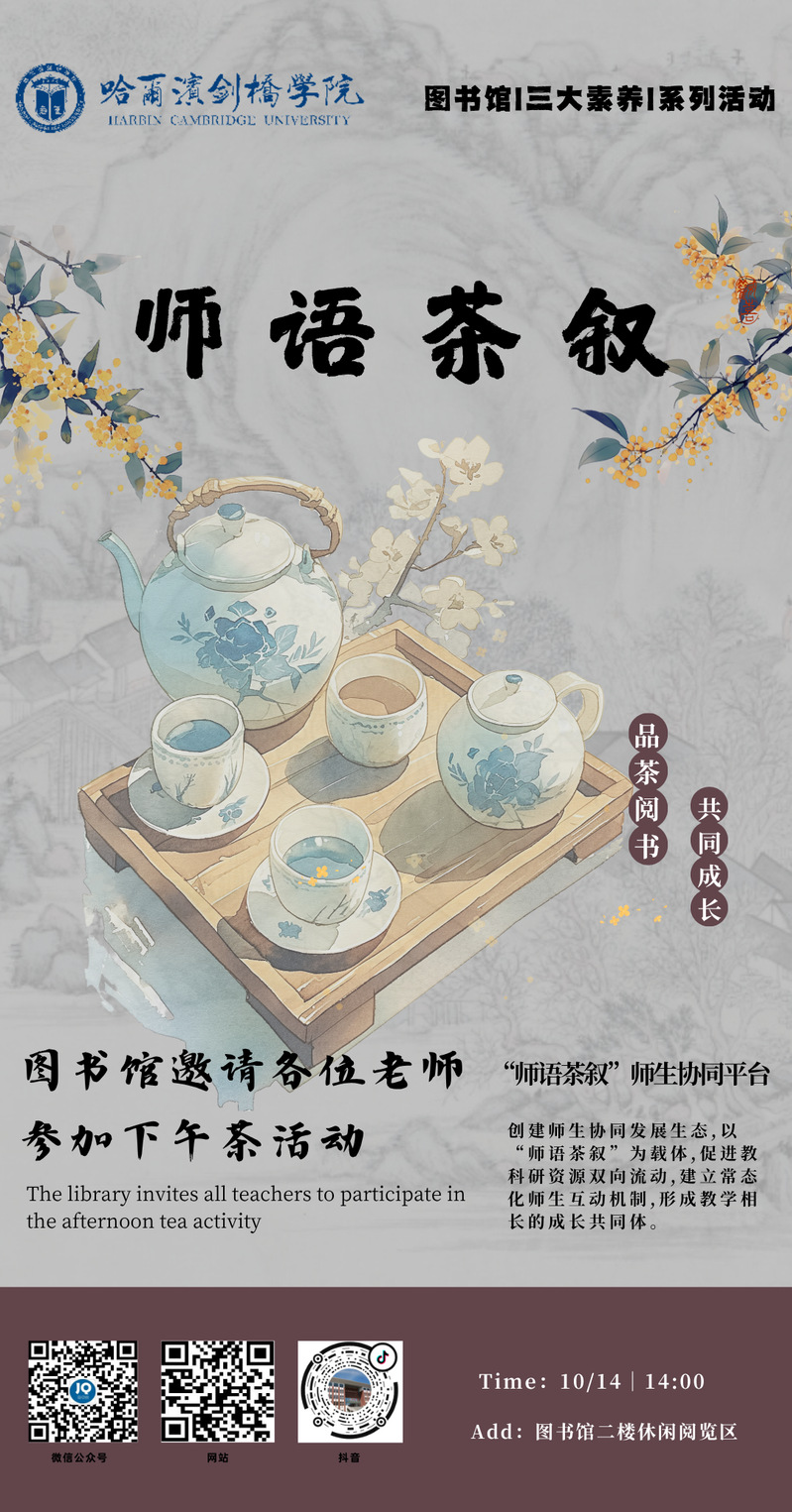 图书馆邀请各位老师参加下午茶活动。“师语茶叙”师生协同平台是创建师生协同发展生态,以“师语茶叙”为载体,促进教科研资源双向流动,建立常态化师生互动机制,形成教学相长的成长共同体。
