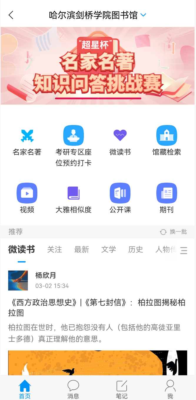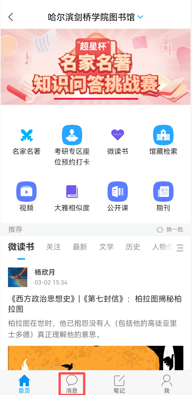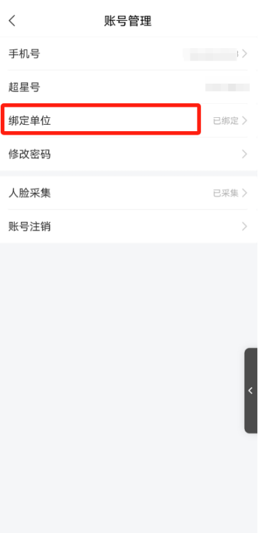 单位绑定:右下角“我”-设置-账号管理-绑定单位-添加单位,单位名称输入并选择“哈尔滨剑桥学院图书馆”,下一步输入学号/工号,确定绑定即可。