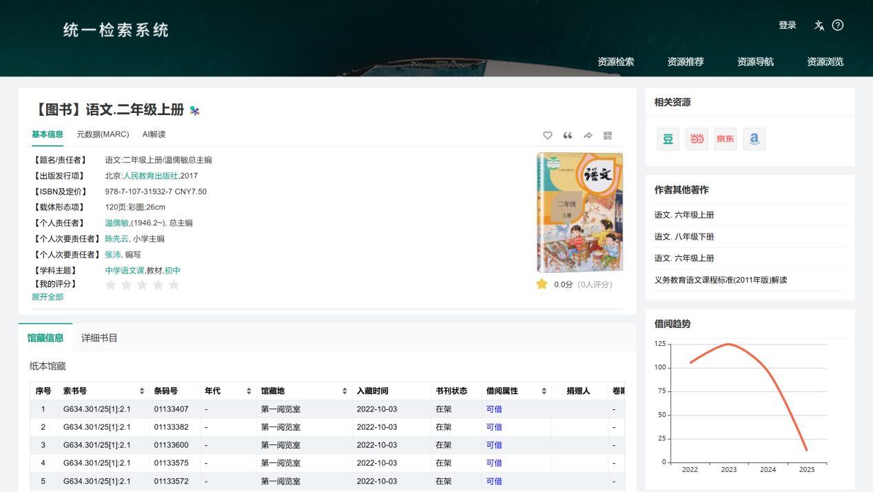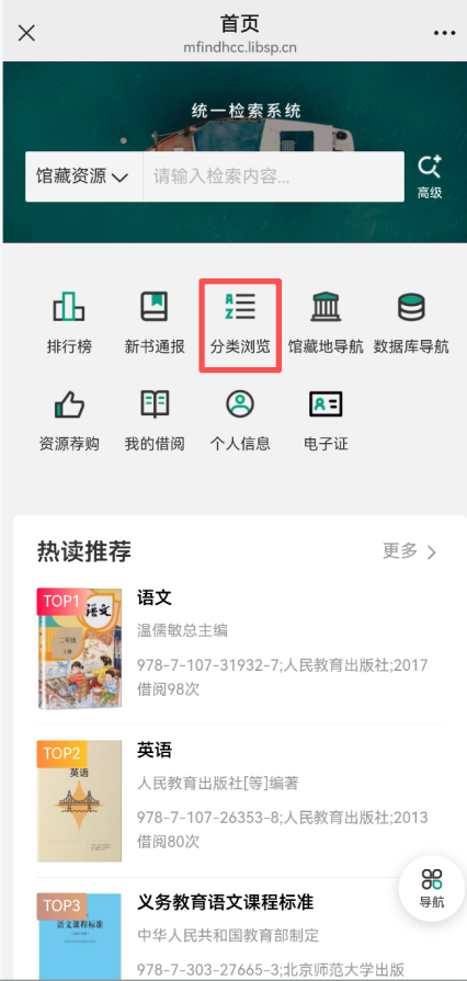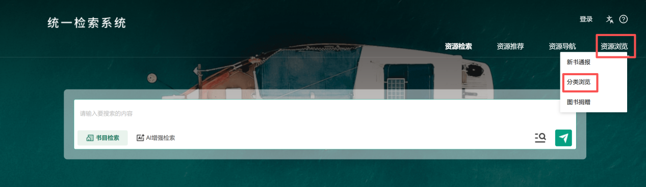 通过上方检索框检索馆藏资源书目信息,或通过分类浏览查看馆藏信息
