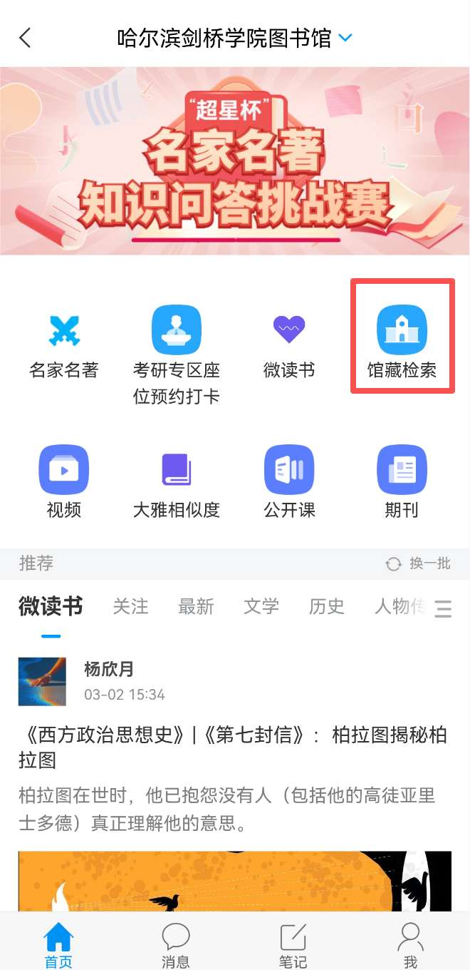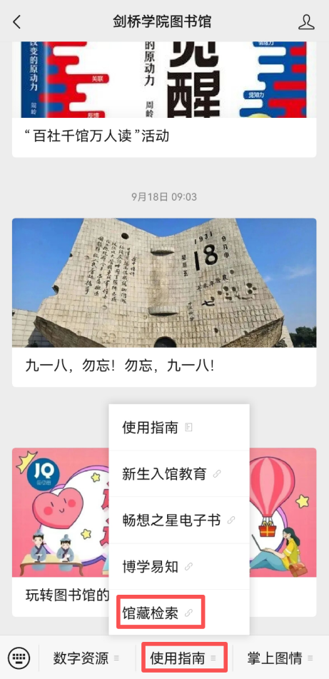 微信公众号关注剑桥学院图书馆,关注后在下方点击使用指南-馆藏检索