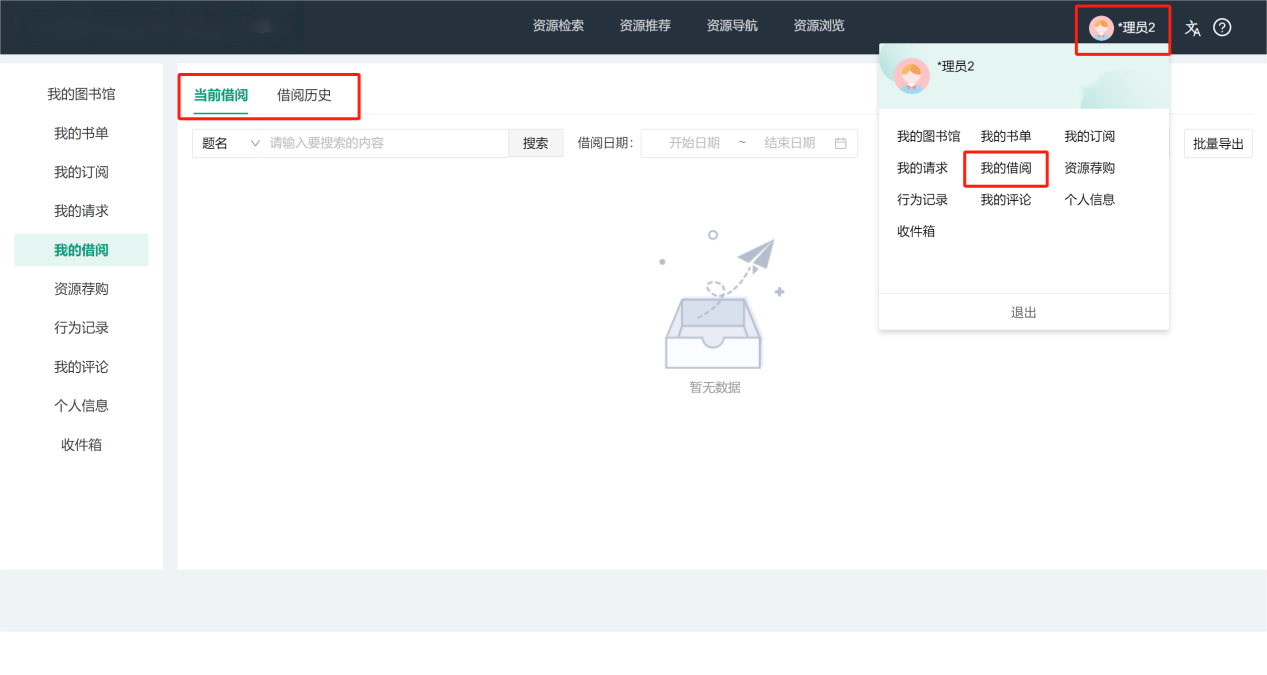 登录后读者通过右上角点击“我的借阅”即可查询当前借阅信息和借阅历史,可按照借阅规则规定进行图书续借