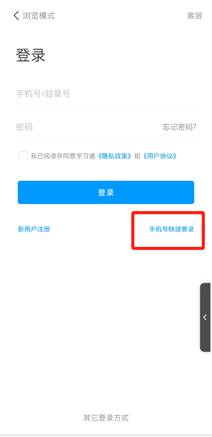 登录学习通:使用手机号快捷登录方式,通过手机号获取验证码登录。